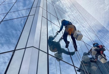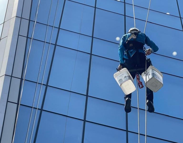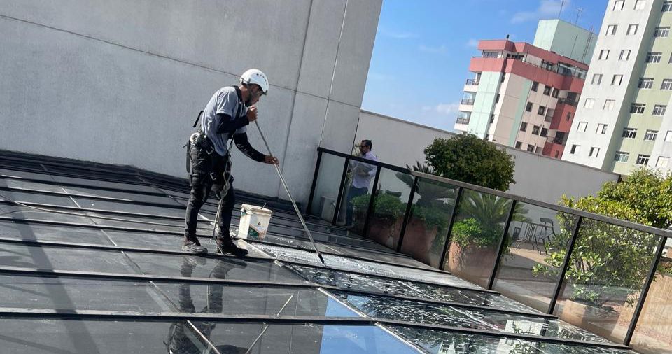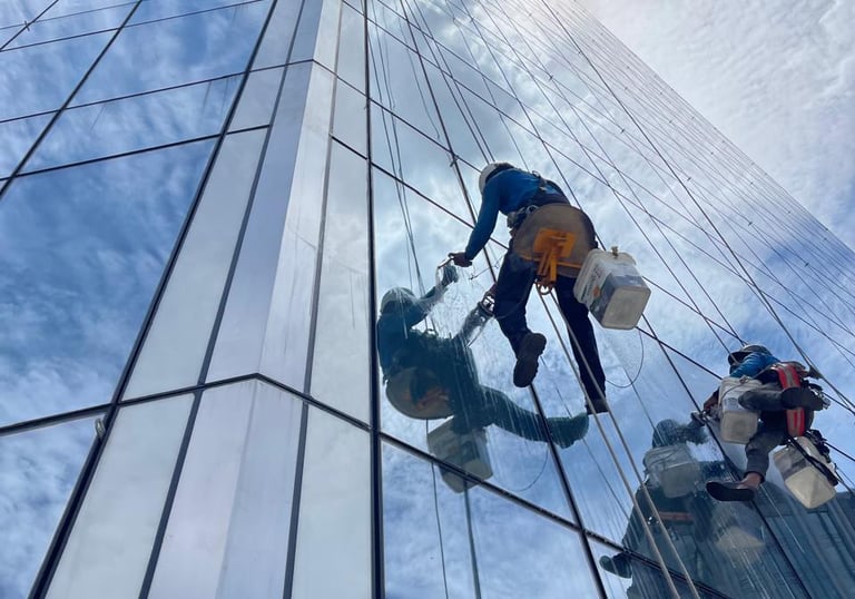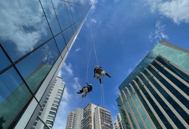 Oferecemos limpeza de vidros, fachadas e telhados com acesso por cordas e alpinismo industrial.